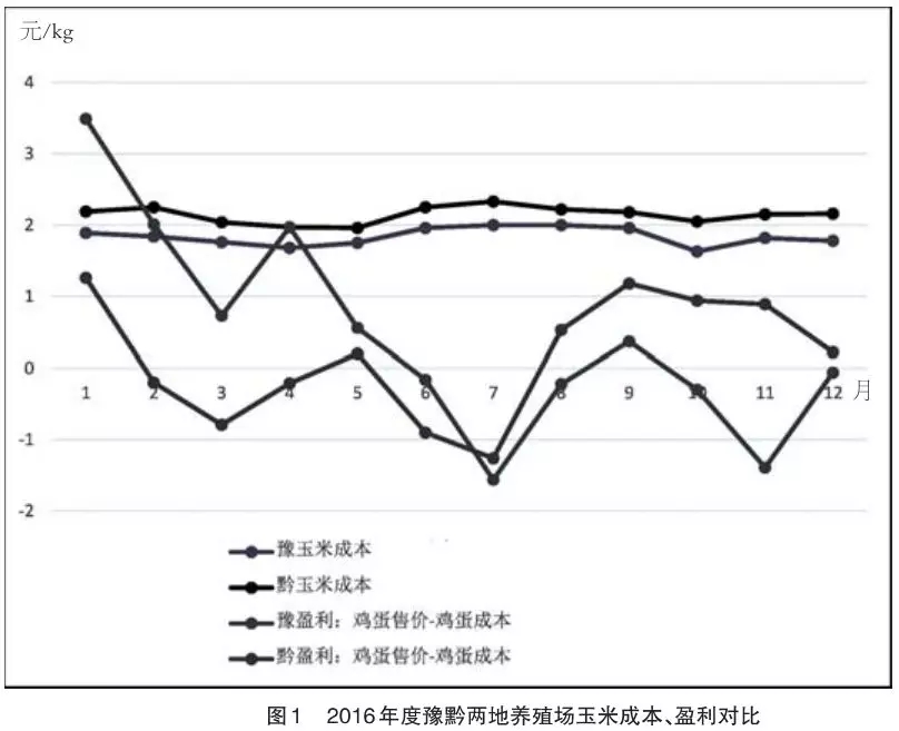 與雞蛋主產(chǎn)區(qū)相比,貴州養(yǎng)殖蛋雞的成本高,不具有成本優(yōu)勢(shì),盈利能力不足。2017年上半年,筆者曾對(duì)2016年度黔豫兩省蛋雞養(yǎng)殖場(chǎng)玉米成本和盈利能力進(jìn)行對(duì)比評(píng)估發(fā)現(xiàn),豫黔兩地養(yǎng)殖場(chǎng)2016年雞蛋成本情況分別為6.99元/kg、8.21元/kg,豫養(yǎng)殖場(chǎng)比黔養(yǎng)殖場(chǎng)雞蛋成本少1.22元/kg。豫黔雞蛋養(yǎng)殖場(chǎng)2016年盈利情況分別為:0.77元/kg、-0.02元/kg。豫養(yǎng)殖場(chǎng)比黔養(yǎng)殖場(chǎng)多盈利0.79元/kg。(見(jiàn)圖1)